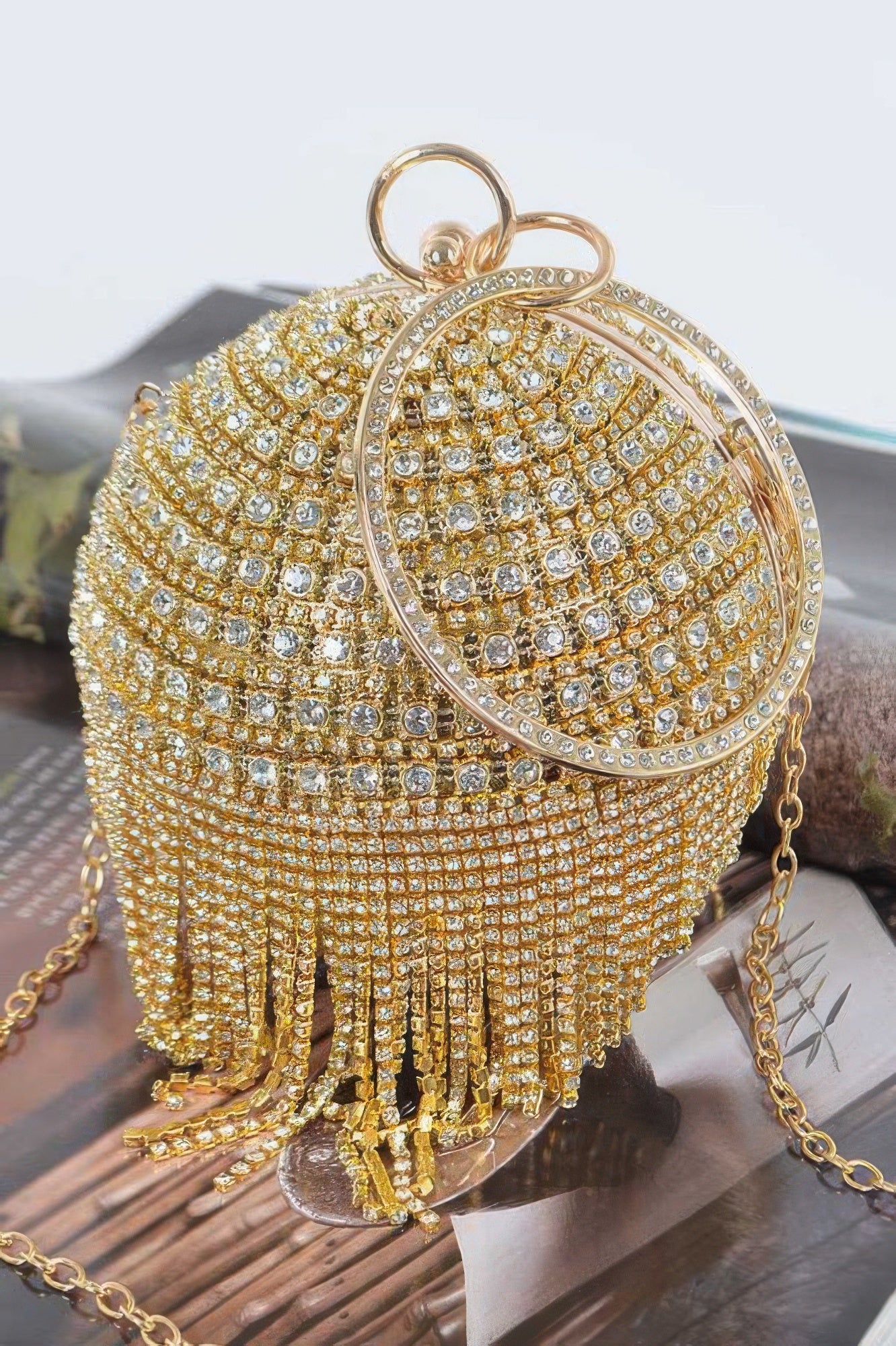 Sparkling from every angle, the Round Rhinestone Fringe Bag is a bold accessory that instantly elevates your ensemble. Designed with a fully rhinestoned finish and dynamic fringe, it captures movement and light beautifully. The rounded silhouette is compact and structured, ideal for carrying just the essentials. Whether styled with a gown or modern jumpsuit, this piece brings a glamorous finishing touch. Pair it with minimal jewelry and let the bag shine.
