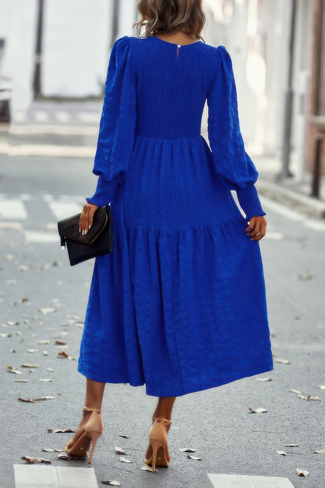 Solid Round Neck Puff Long Sleeve Midi Dress