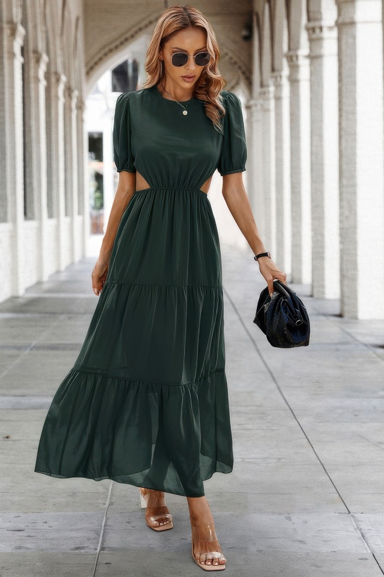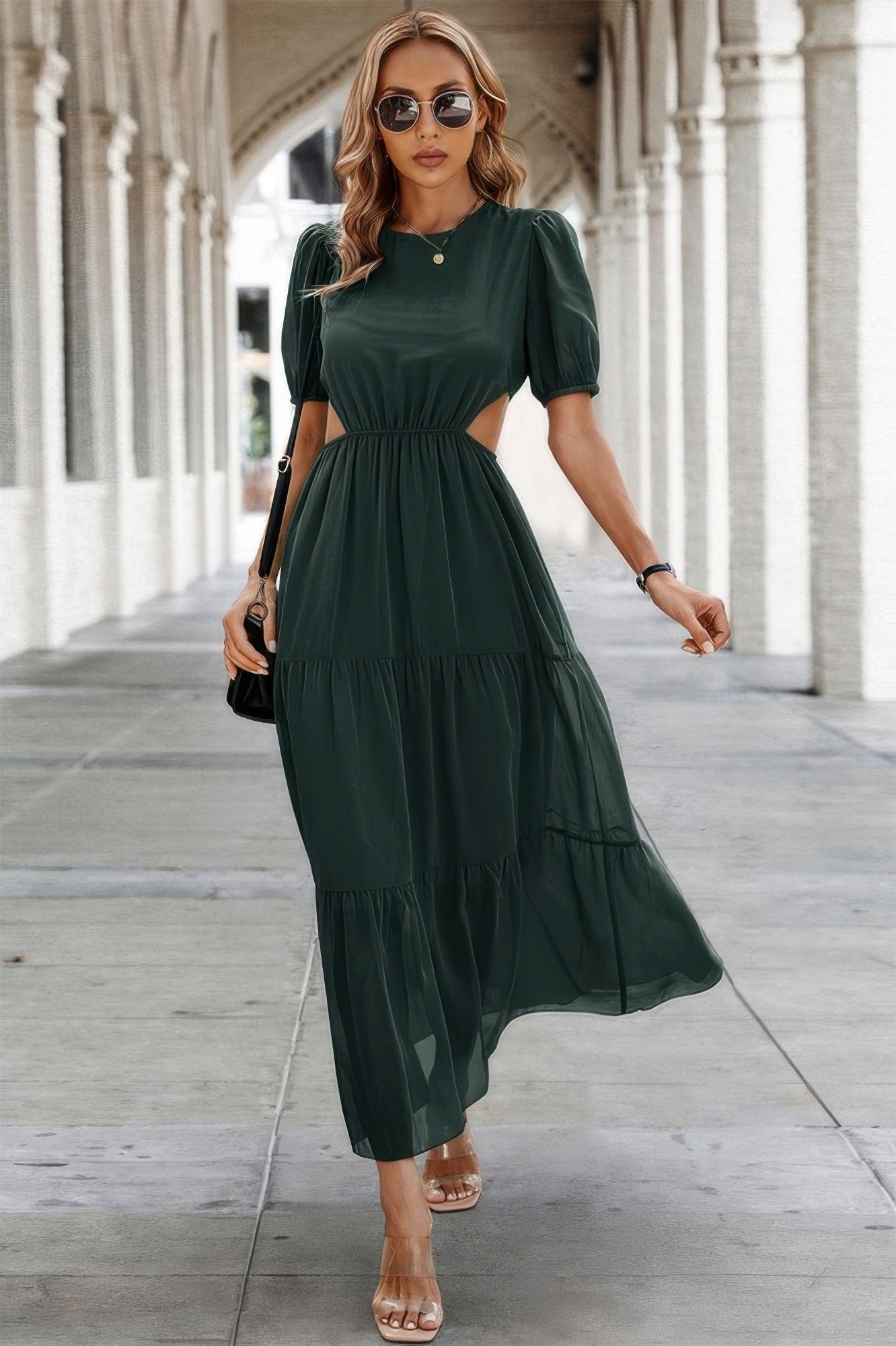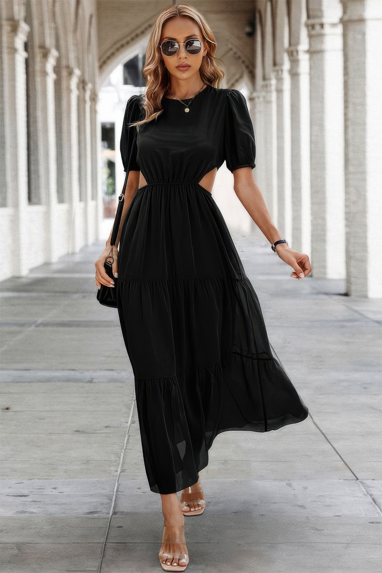 Cut Out Waist Ruffle Hem Puff Sleeves Fit Dress
