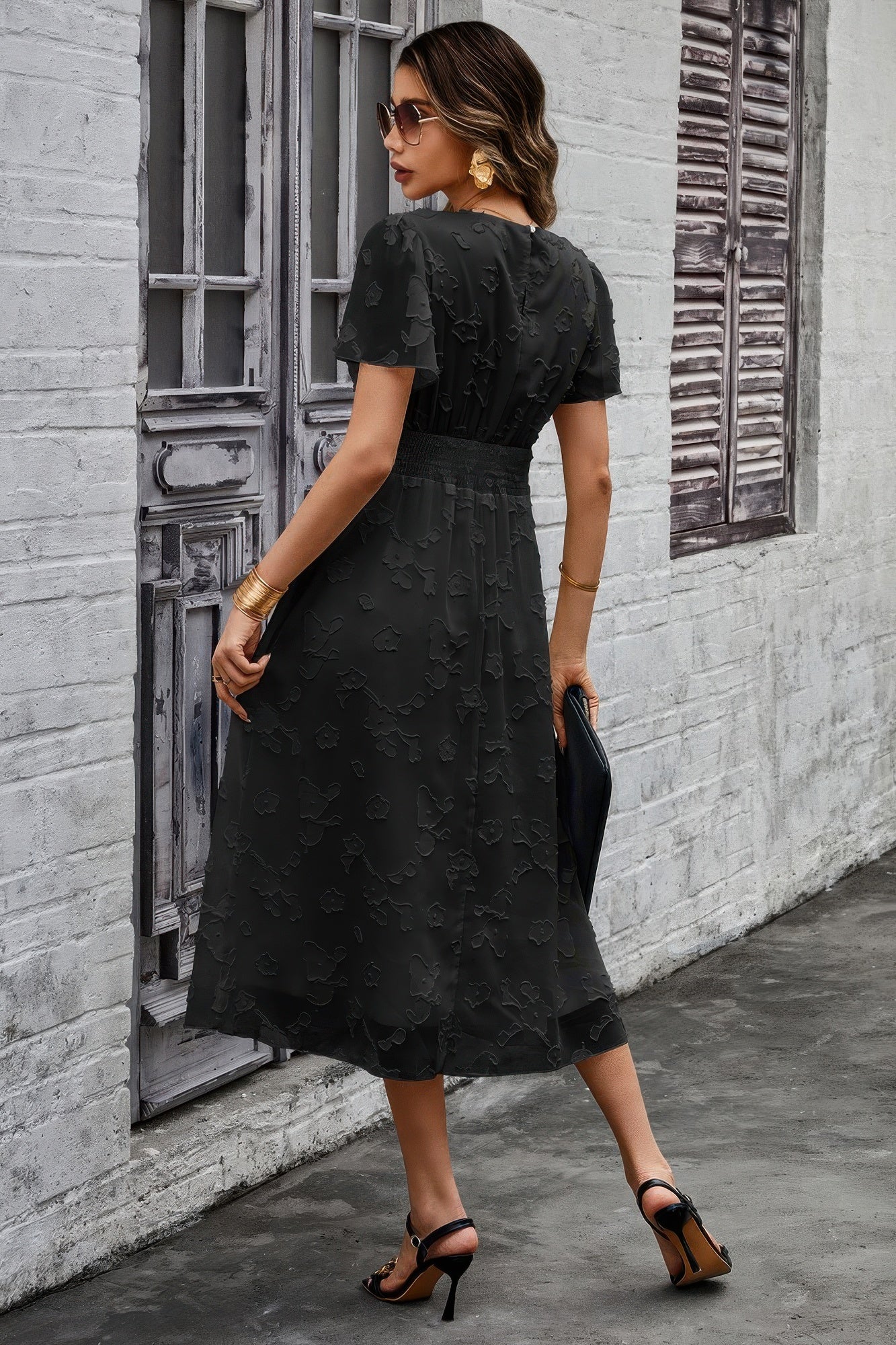 The Deep V Ruched Elastic Belt Smocked Midi Dress blends comfort with effortless style, making it a perfect pick for any occasion. Crafted from soft, comfy material, this dress features a flattering deep V neckline that adds a hint of allure. The ruched elastic belt cinches the waist beautifully, while the smocked bodice offers a flexible, comfortable fit that moves with you. With its midi length and easygoing silhouette, this dress is a versatile choice for casual outings, vacations, or laid-back gatherings.