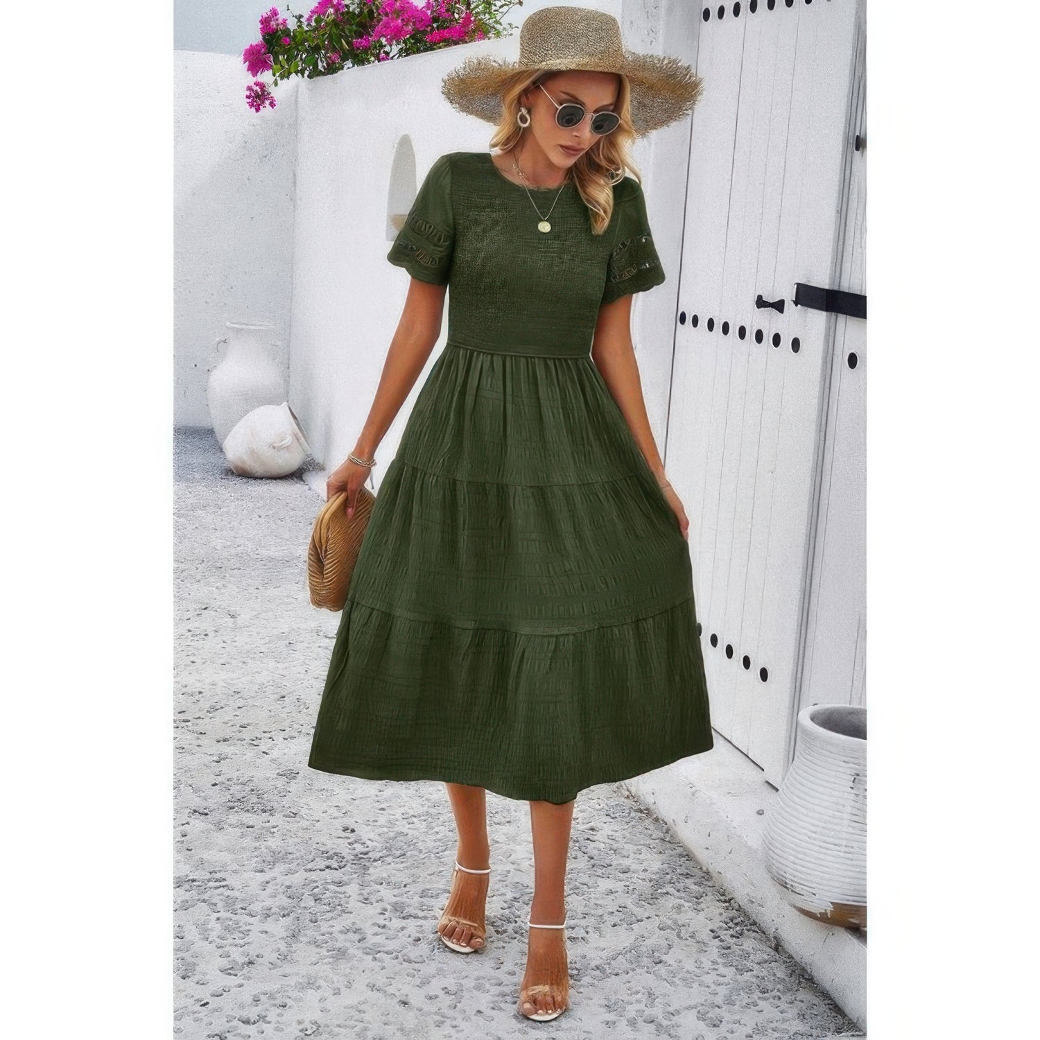 Lace Round Neck Ruched Fit Ruffle Solid Dress