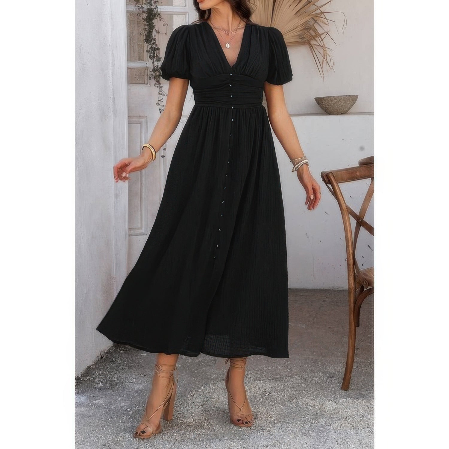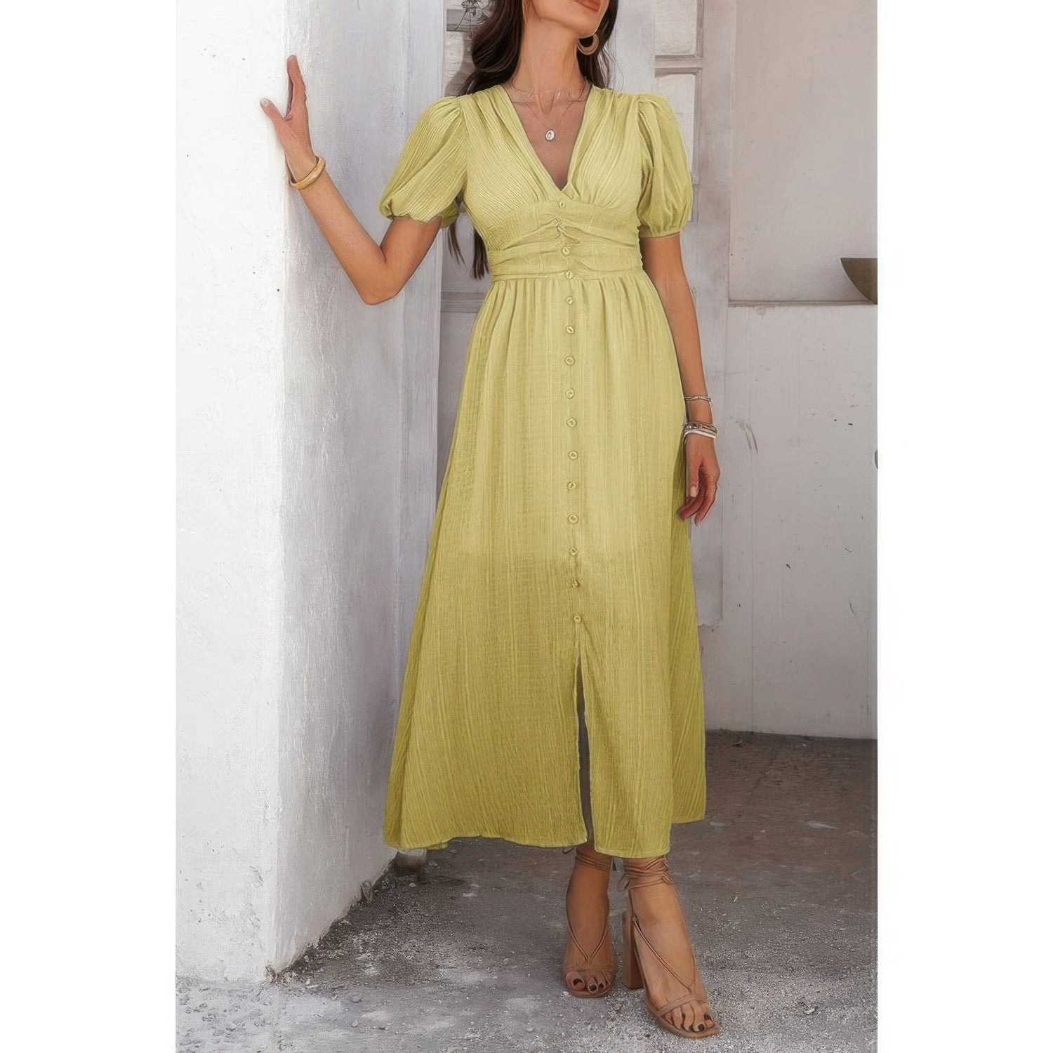 Feminine and refined, this Solid V-Neck Puff Sleeves Knot Detail Dress brings elegant charm to your everyday wardrobe. The flattering V-neckline and voluminous puff sleeves offer a timeless silhouette, while the front knot detail adds definition and a stylish focal point. Crafted from 100% polyester, it provides a smooth, lightweight feel that’s perfect for warm-weather days. Whether you’re dressing up for a brunch or heading out for a casual afternoon, this dress delivers easy polish with a touch of sophistication.