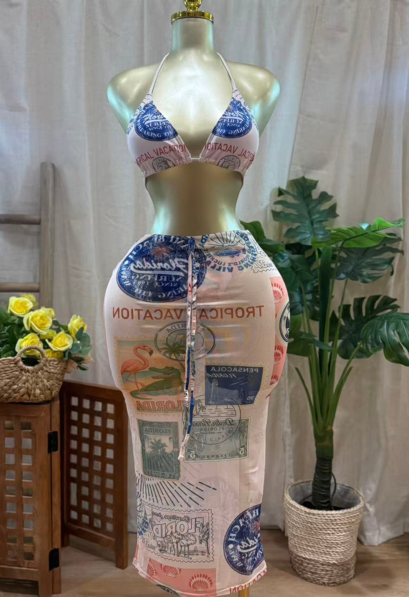 The Sunstamp Bikini Set delivers a timeless swim silhouette with a nostalgic twist. Featuring a classic triangle top and matching bottoms, this set is accented with a vintage postcard-inspired print for standout appeal. Adjustable tie closures allow for a customizable, flattering fit that moves comfortably with you. Crafted from a smooth stretch fabric, it offers both flexibility and support for all-day wear. Perfect for poolside lounging or seaside escapes, this bikini blends retro charm with modern comfort. A confident choice for sunny days and warm-weather getaways.