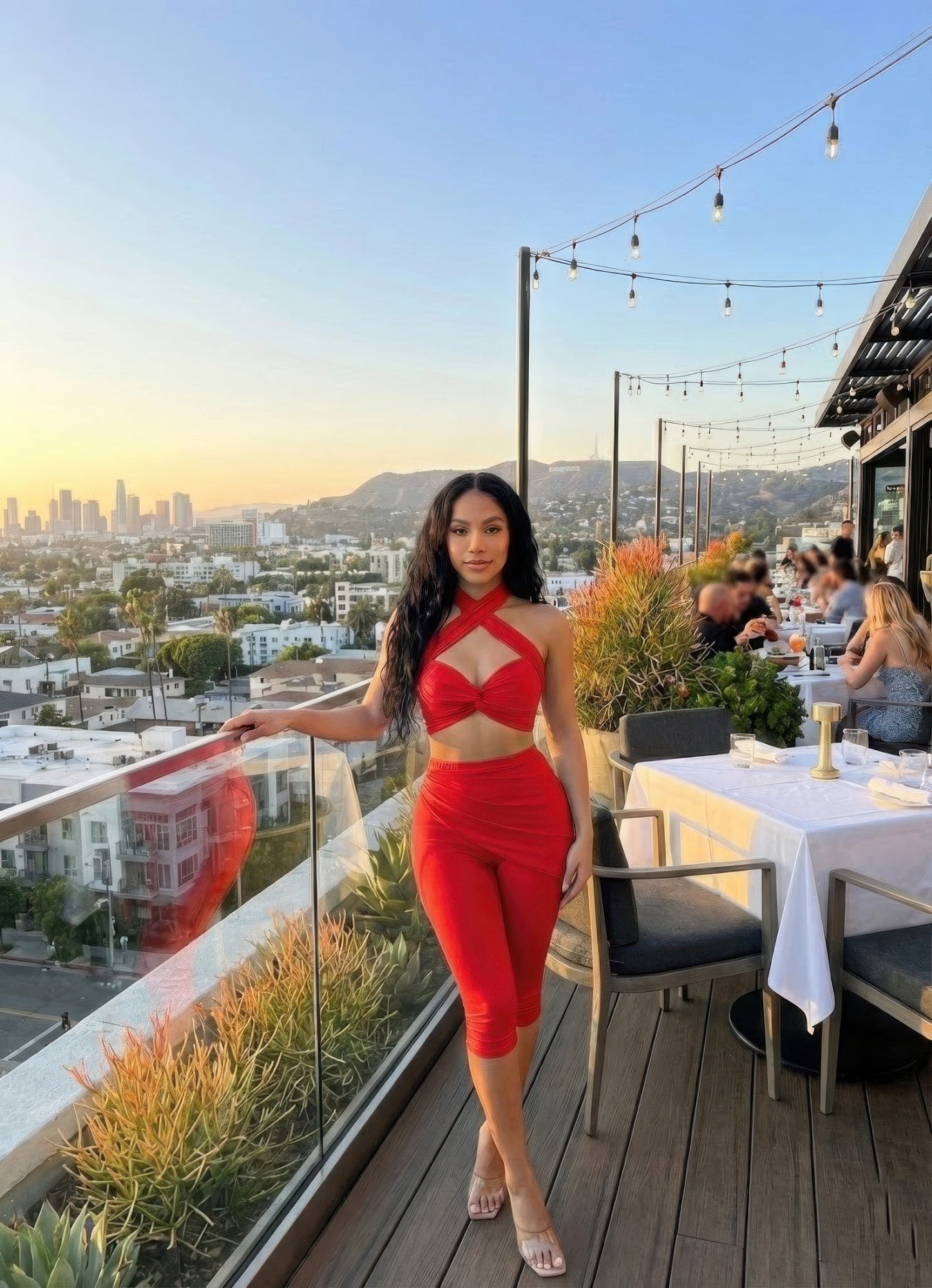 Crisscross halter neckline with self-tie at the nape